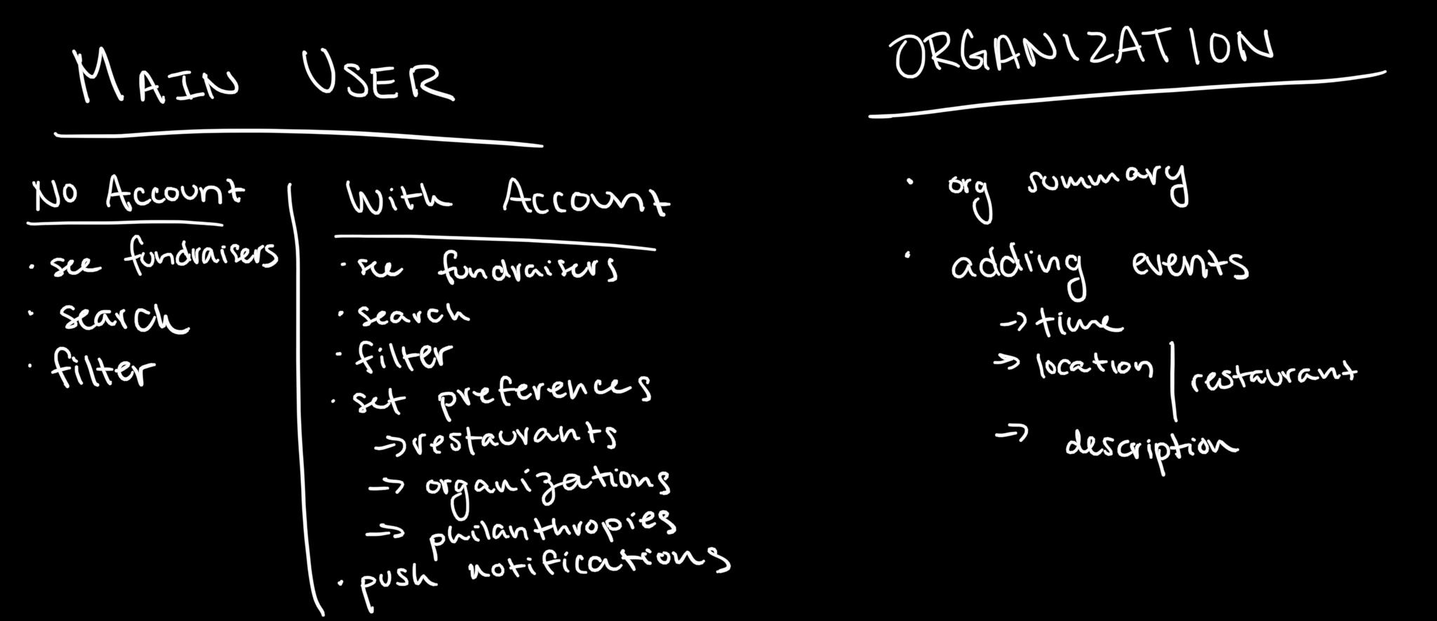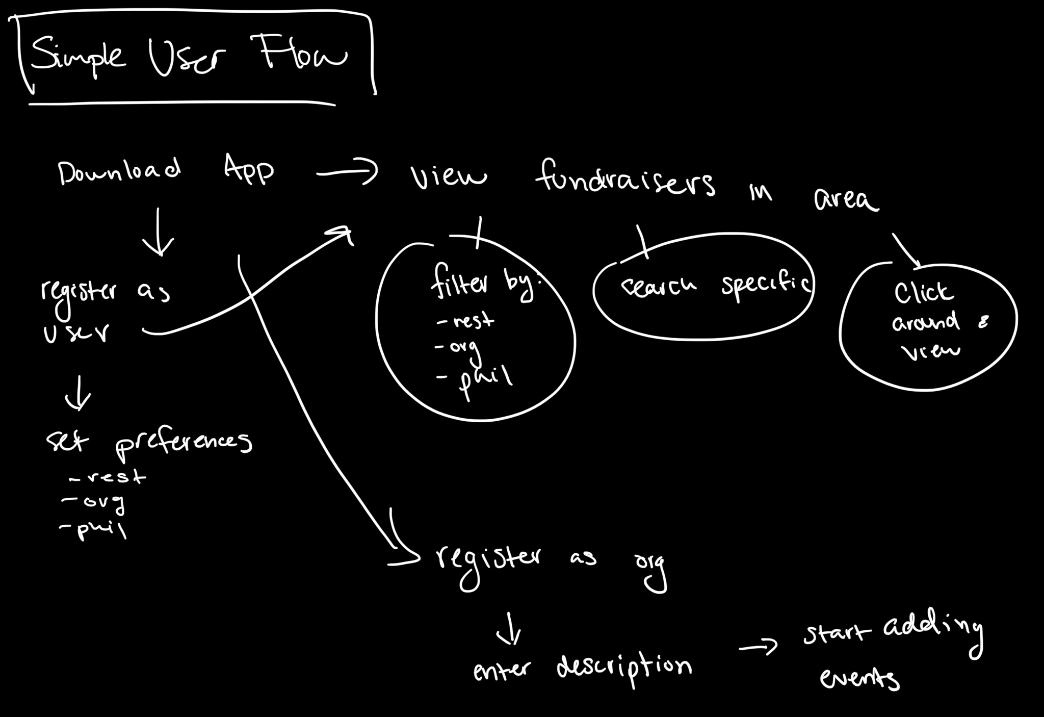 We began the initial design for the MVP of the app by mapping out the user journeys for the 3 personas: a user without an account, a user with an account, and a user registering an organization.