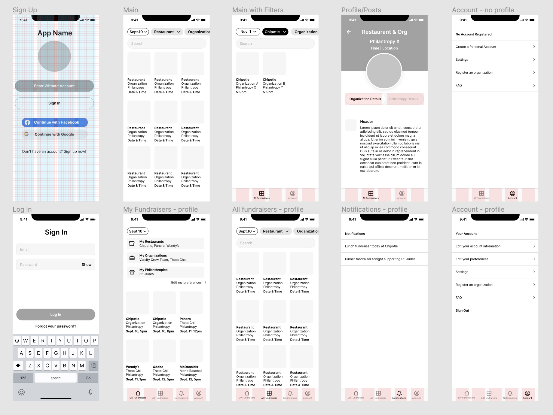 After the flows were finalized, I began creating some low fidelity wireframes.