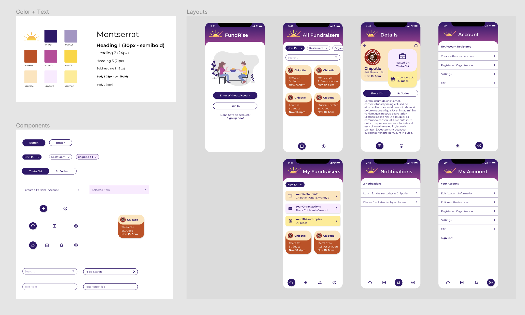 The next step was to create a style guide. For the color palette, I played around with many variations that mimicked a sunrise (purples, pinks, oranges, yellows) to reflect the name (FundRISE) and to evoke feelings of calm as well as playful and bright energy. For the type I chose Montserrat - the minimal and geometric style making it well-balanced with the colorful interface and optimized for digital use. Included in the style guide were some initial components and layouts.
