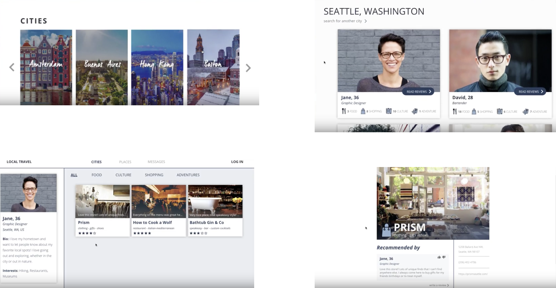 A few highlights of the website include the city spotlight component on the bottom of the homepage, the user (local) cards once searching for a city, a singular user (local) profile page, and the user (local) review of a specific place page (on the right, respectively).