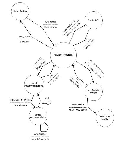 Next, we built out a Conceptual Model (including objects, object attributes, object relationships, actions of objects, actions on attributes, and actions on relationships). After this we performed a Semantic Level analysis on various actions (which included the function, parameters, description, feedback, errors, and task-command analysis). We also performed a Lexical Design, and created a Syntactic Level graph, specifically for viewing a profile (shown on the right).