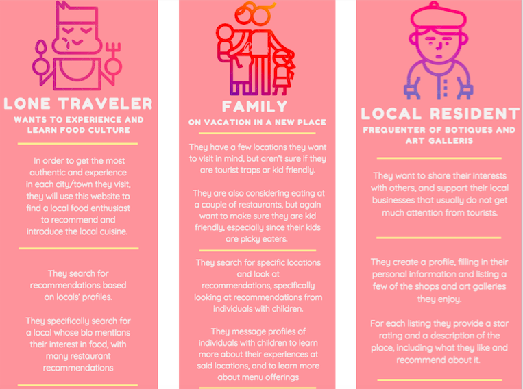 Using the characteristics and goals we came up with, we settled on 3 general user personas and usage scenarios. The first persona is a lone traveler who uses the website to find spots they can experience the food culture of the city, The second persona is a family on vacation, in search for child-friendly tourism activities. The last persona is the "other side" of the application, the local resident who frequents boutiques and art galleries and wants to share their interests and local spots with tourists.